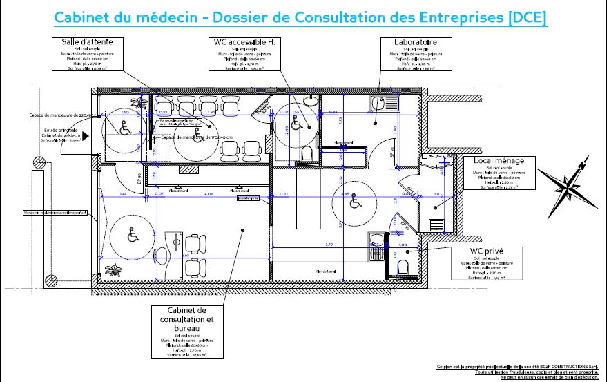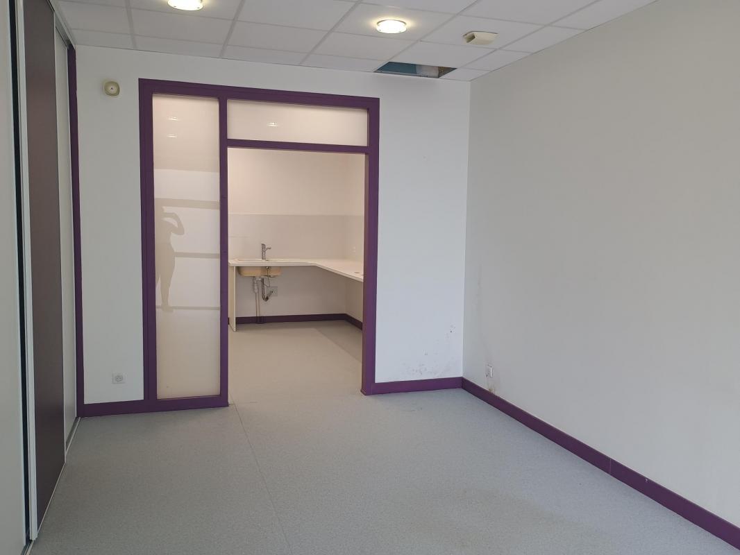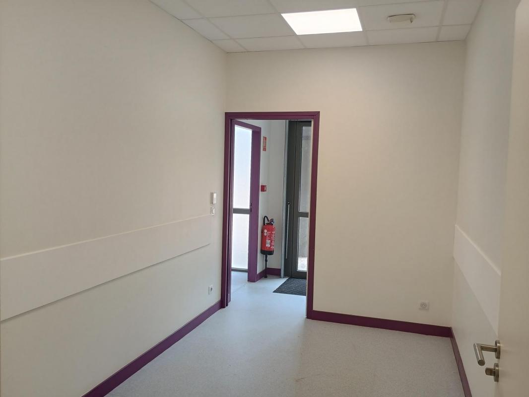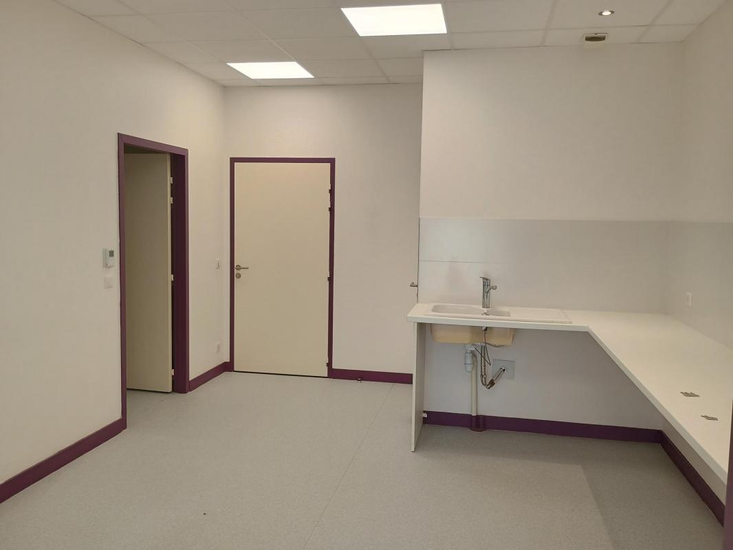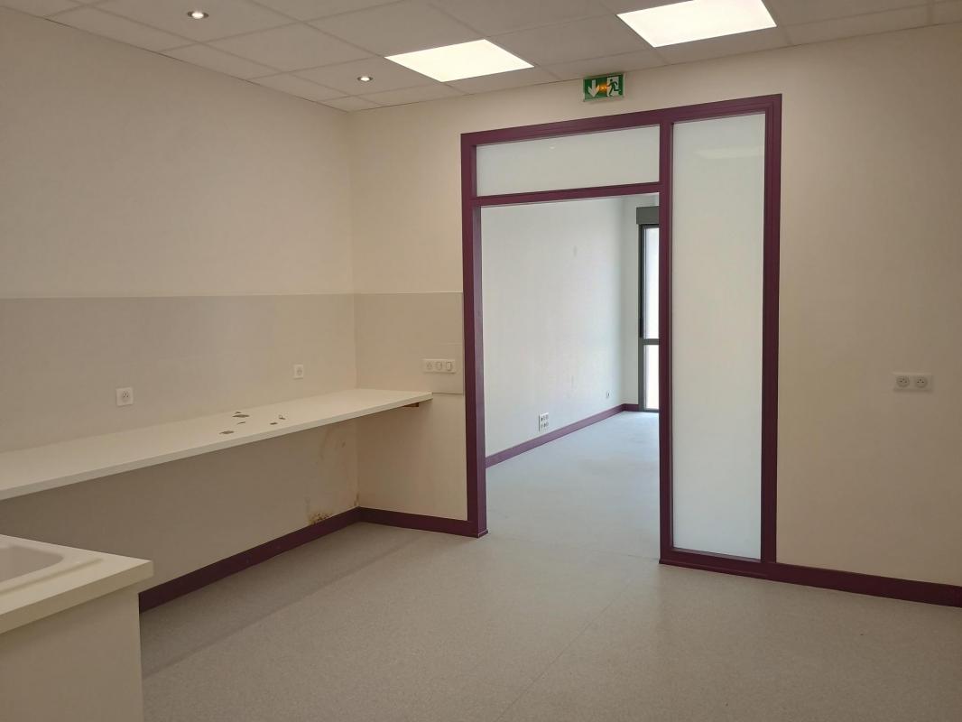 Le local est composé d'une entrée avec salle d'attente avec sanitaire PMR, d'un bureau avec deux espaces distincts, un atelier, un sanitaire privé et un local de rangement le tout pour une surface de 66 m².