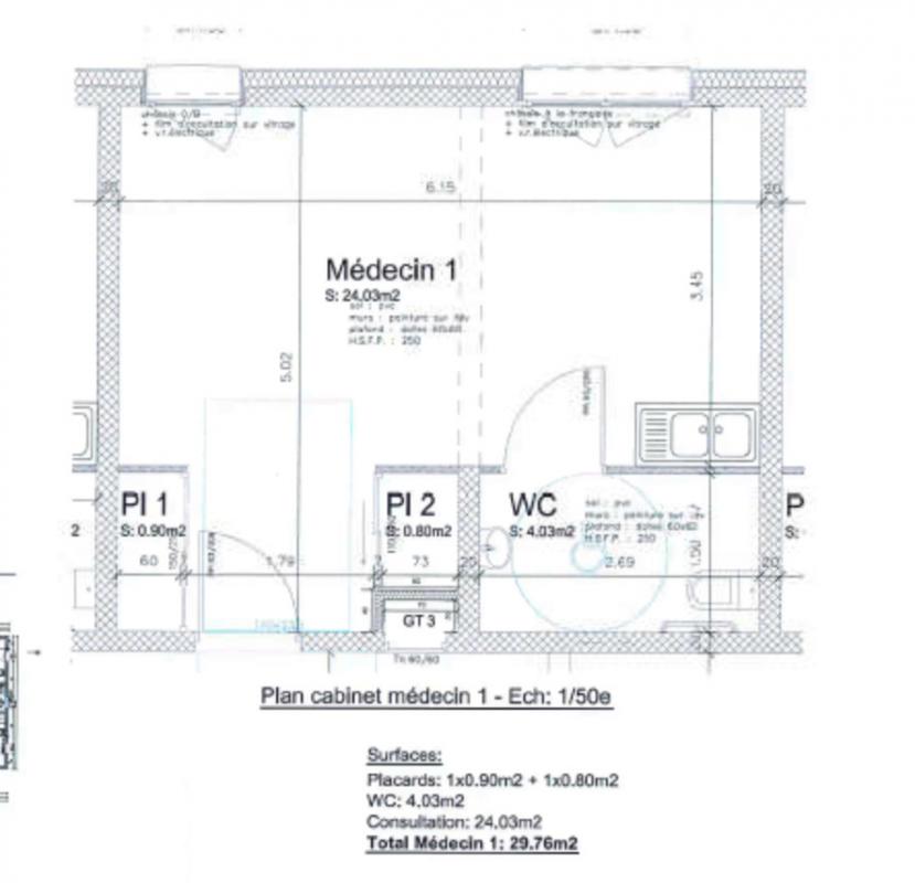 Le cabinet est composé d'une pièce principale équipé de 2 placards muraux, un évier puis un sanitaire PMR privatif.